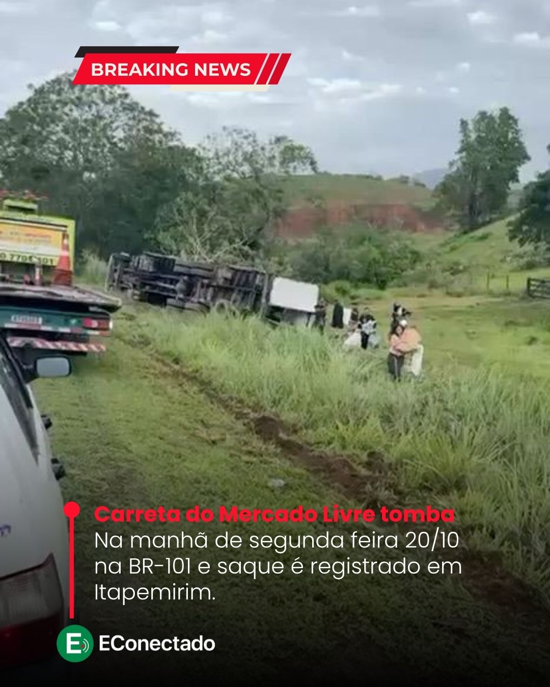Carreta do Mercado Livre tomba na BR-101 e saque é registrado em Itapemirim